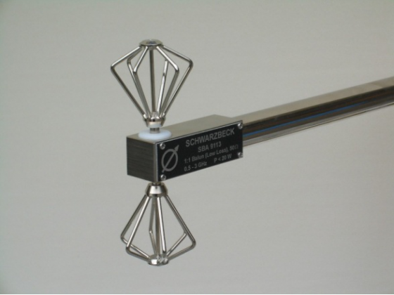 SBA 9113B 小型雙錘天線80MHz-3GHz,SBA 9113B 線性極化微波雙錘天是在 SBA 9113 天線的基礎(chǔ)上,增加了一個(gè) balum,從而將頻率范圍低端擴(kuò)展到0MHz。在保持了9113-balun 出色的高頻特性的基礎(chǔ)上對(duì)低頻段進(jìn)行了顯著的擴(kuò)展。所以SBA 9113B 可以用作抗擾度測(cè)試中選頻場(chǎng)探測(cè)器,例如按照IEC 61000-4-3 規(guī)定與頻譜分析儀或EMI 接收機(jī)組合使用。依據(jù)頻率的不同,1V/m 的場(chǎng)強(qiáng),在接收機(jī)的讀數(shù)為60-95 dB?V 之間。雖然SBA 9113B 可以直接連接到接收機(jī),場(chǎng)強(qiáng)可達(dá)30V/m ,還是推薦在天線連接器上使用一個(gè)固定的衰減器,這樣能達(dá)到更好的阻抗匹配和測(cè)試精度以及更寬的測(cè)量范圍。