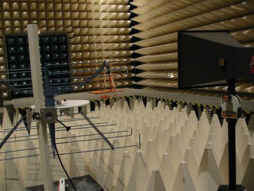 電波暗室是主要用于模擬開闊場,同時(shí)用于輻射無線電騷擾(EMI)和輻射敏感度(EMS)測量的密閉屏蔽室。電波暗室的尺寸和射頻吸波材料的選用主要由受試設(shè)備(EUT)的外行尺和測試要求確定,分3m法暗室、5m法暗室、10m法暗室。在屏蔽室的天花板和四面墻貼上吸波材料,地面的吸波材料采用活動式鋪設(shè),即構(gòu)成EMC實(shí)驗(yàn)室。該EMC暗室(實(shí)驗(yàn)室)為十米法半電波暗室,在30MHz至18GHz的頻率范圍內(nèi),在3米測試距離擁有2米靜區(qū),10米測試距離擁有3米或更大靜區(qū),該暗室滿足FCC、CE和VCCI對十米法暗室的認(rèn)證、測試要求。
