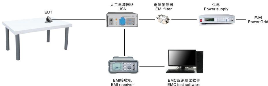電源線(xiàn)傳導(dǎo)騷擾的測(cè)試,盡管不同產(chǎn)品由不同標(biāo)準(zhǔn)進(jìn)行進(jìn)行規(guī)定,但基本方法是一樣的,由人工電源網(wǎng)絡(luò)(AMN或稱(chēng)線(xiàn)路阻抗穩(wěn)定網(wǎng)絡(luò)LISN)和EMI測(cè)試接收機(jī)組成,其中人工電源網(wǎng)絡(luò)可以在給定頻率范圍內(nèi),為騷擾電壓的測(cè)量提供標(biāo)準(zhǔn)規(guī)定的50歐姆阻抗,并使受試設(shè)備(EUT)與電源相互隔離。