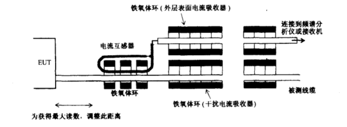 30MHz以上的發(fā)射可以直接作為輻射場測量,同樣也可以測量連接電纜上的干擾電流并將其與可接受的場強水平關(guān)聯(lián)起來。有一些標準(主要用于只有電源線連接的小型裝置,例如標準EN 55014)規(guī)定了電源線纜上干擾功率的測量。這種測量的優(yōu)點是不需要在大的開闊地中進行測試,但仍需要在一個相當大的屏蔽室中進行測試,而且測試方法有些笨拙。使用的傳感器是一個吸收裝置,即大家熟悉的鐵氧體吸收鉗。鐵氧體吸收鉗(經(jīng)常使用的型號是MDS-21)由使用兩個或三個鐵氧體環(huán)的電流互感器與一個耦合環(huán)組成,它們均為可分開式,方便裝入電纜(如圖所示)。還有套在被測電源線上的更多的鐵氧體環(huán),它們形成一個功率吸收器和阻抗穩(wěn)定器。鐵氧體吸收鉗使用輸出功率和輸入功率的關(guān)系曲線進行校準,即插入損耗。使用鐵氧體吸收鉗的目的是衰減反射信號和可能出現(xiàn)在電流互感器上的無關(guān)信號。從電流互感器到測量儀表的線纜上也應套上鐵氧體環(huán),以衰減電纜屏蔽層上的電流。因為互感器的輸出正比于被測電纜上的共模電流,所以可直接用于測量噪聲功率。