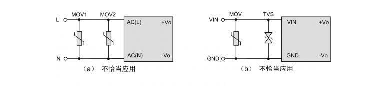 由于電源模塊體積小,在EMC要求比較高的場(chǎng)合,需要增加額外的浪涌防護(hù)電路,以提升系統(tǒng)EMC性能,提高產(chǎn)品的可靠性。如圖2所示,為提高輸入級(jí)的浪涌防護(hù)能力,在外圍增加了亞敏電阻和TVS管。但圖中的電路(a)、(b)原目的是想實(shí)現(xiàn)兩級(jí)防護(hù),但可能適得其反。如果(a)中MOV2的壓敏電壓和通流能力比MOV1低,在強(qiáng)干擾場(chǎng)合,MOV2可能無(wú)法承受浪涌沖擊而提前損壞,導(dǎo)致整個(gè)系統(tǒng)癱瘓。同樣的,電路(b),由于TVS響應(yīng)速度比MOV快,往往是MOV未起作用,而TVS過(guò)早損壞。