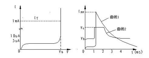 如果用圖示儀觀察TVS的特性,就可得到圖1中左圖所示的波形。如果單就這個(gè)曲線來看,TVS管和普通穩(wěn)壓管的擊穿特性沒有什么區(qū)別,為典型的PN結(jié)雪崩器件。