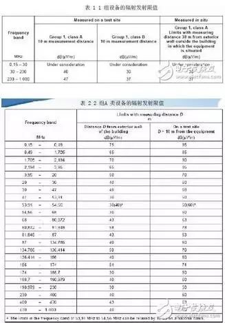 1 組A 類和2 組A 類設(shè)備的發(fā)射限值如表1 和表2 所示,兩組的限值有一定差異。
