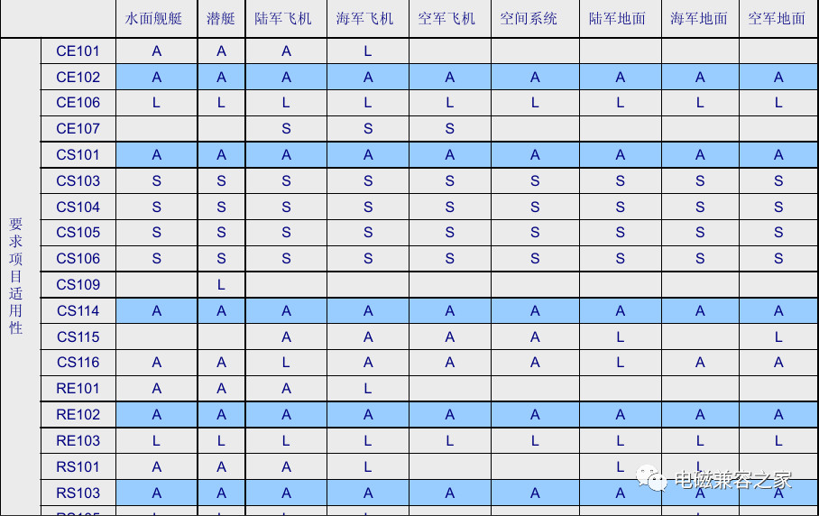 對(duì)于各種不同的軍用安裝平臺(tái),上述19項(xiàng)EMC試驗(yàn)并非全部是必做的。所謂的軍用安裝平臺(tái)分為水面艦船、潛艇、陸軍飛機(jī)(含航線(xiàn)保障設(shè)備)、海軍飛機(jī)、空軍飛機(jī)、空間系統(tǒng)(含運(yùn)載火箭)、陸軍地面、海軍地面、空軍地面9類(lèi)。在GJB151A-97標(biāo)準(zhǔn)中,每個(gè)試驗(yàn)項(xiàng)目對(duì)每種平臺(tái)的適用性都作出了規(guī)定。