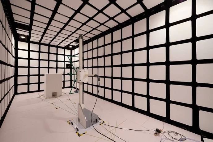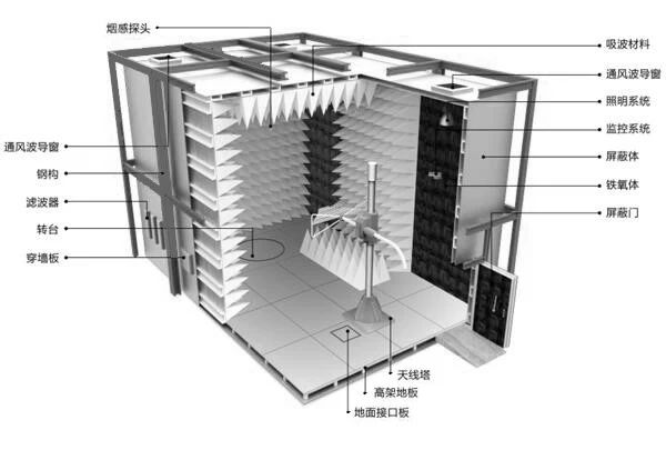 半電波暗室(Semi-Anechoic Chamber,簡稱SAC),也稱做EMC暗室,除地面為金屬反射面外,其余五面均貼有吸波材料,主要模擬開闊場的測試條件。主要用于輻射騷擾(EMI)和輻射敏感度(EMS)測量,部分輻射敏感度試驗會在地面增加吸波材料以提高場均勻性。
