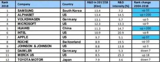 全球研發(fā)投入排名:華為第五,蘋果第七
