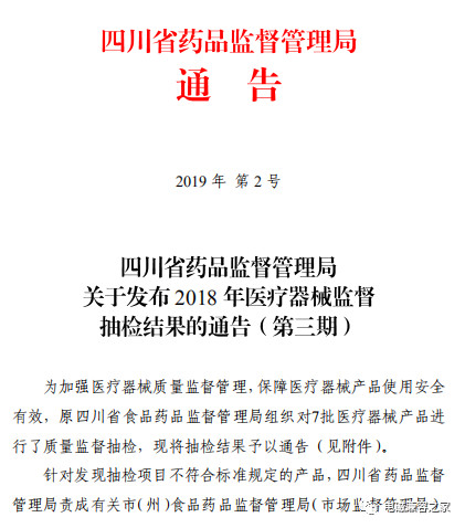 | 四川省藥品監(jiān)督管理局關(guān)于發(fā)布2018年醫(yī)療器械監(jiān)督抽檢結(jié)果的通告(第三期) |